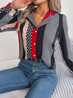 Autumn/Winter Career Chic Contrasting Polka Dot Turndown Collar Long Sleeve Shirt Women’s Clothing