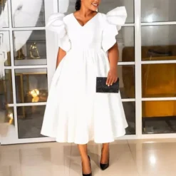 Women’s Spring And Summer Short-sleeved Round Neck Wrap Hip Skirt Pleated Mid-length Dress