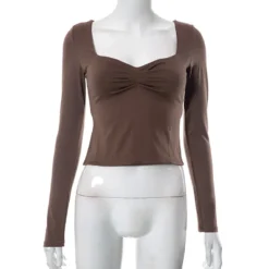 Women’s Autumn Solid Color Square Neck Long Sleeve Gathered Side Slit T-Shirt Top For Women