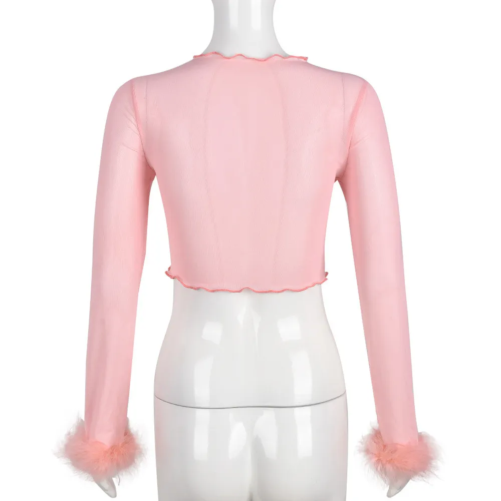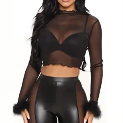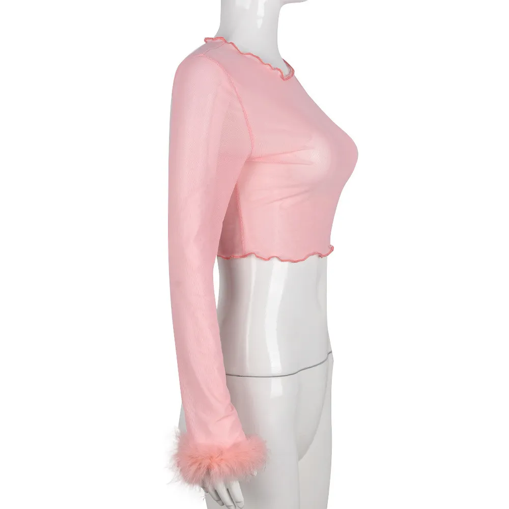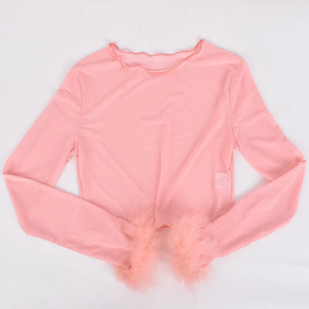 | Product Name | Autumn Mesh See-Through Feather Patchwork Slim Sexy Women’s T-Shirt |