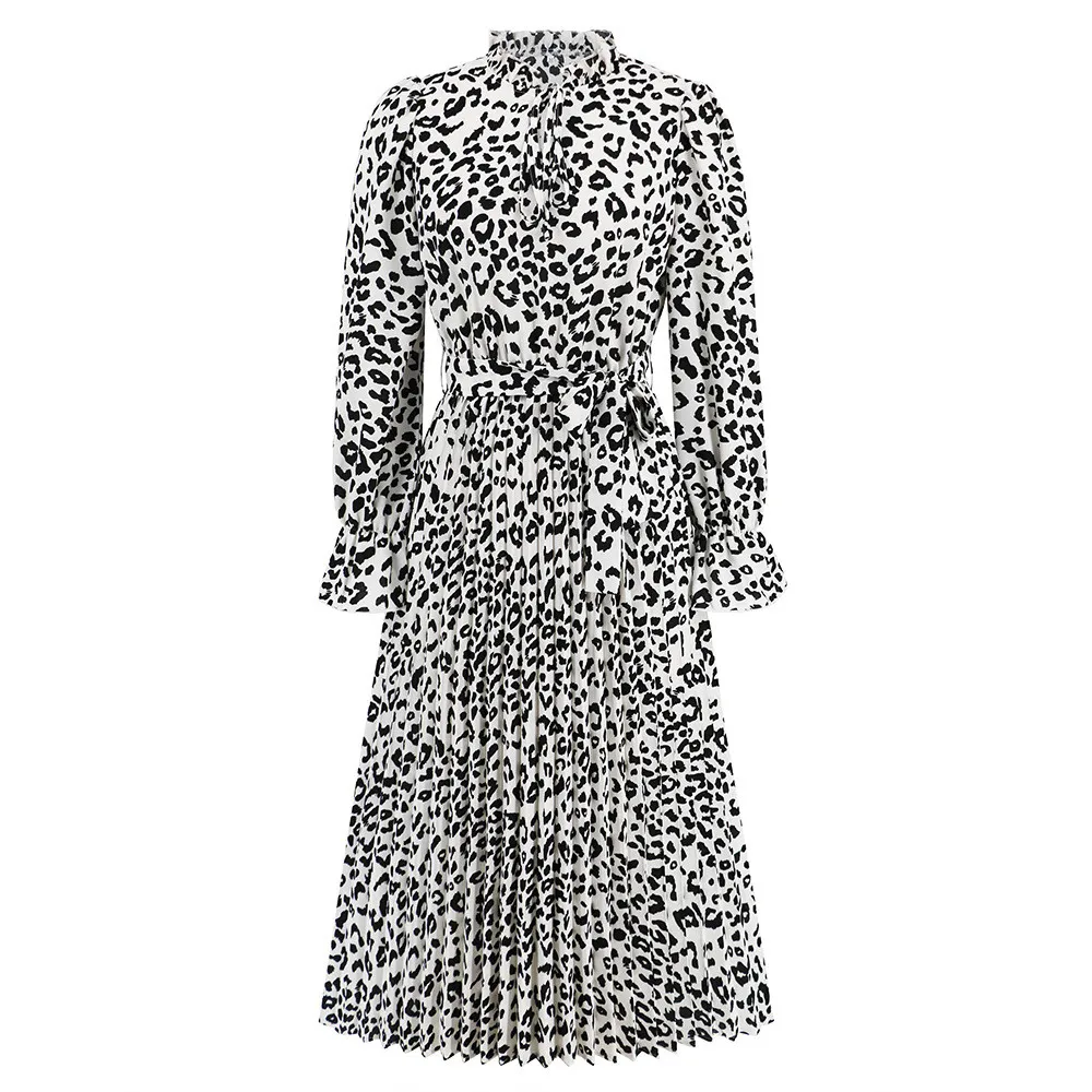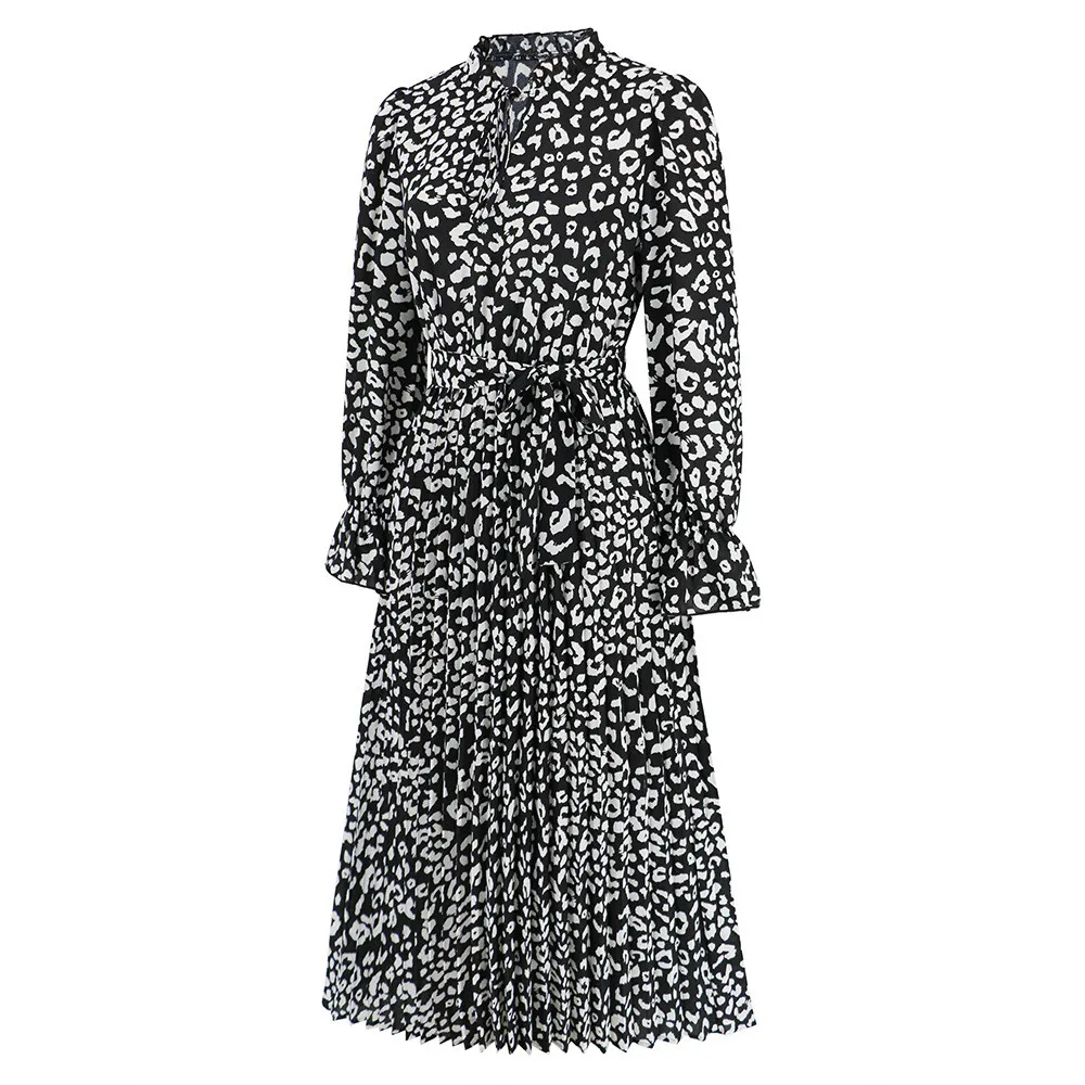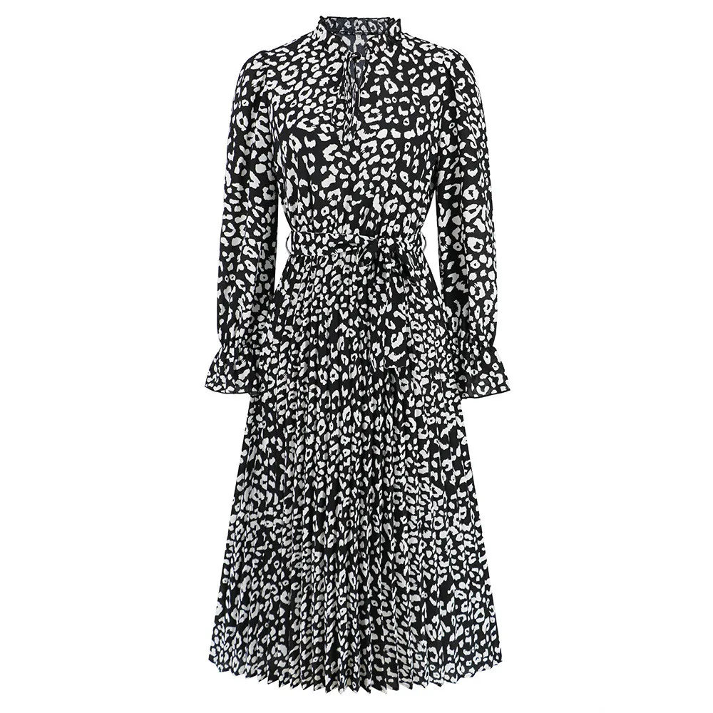 | Product Name | Fall Winter Ladies Chic Leopard Stand Collar Tie Pleated Casual Midi Dress |