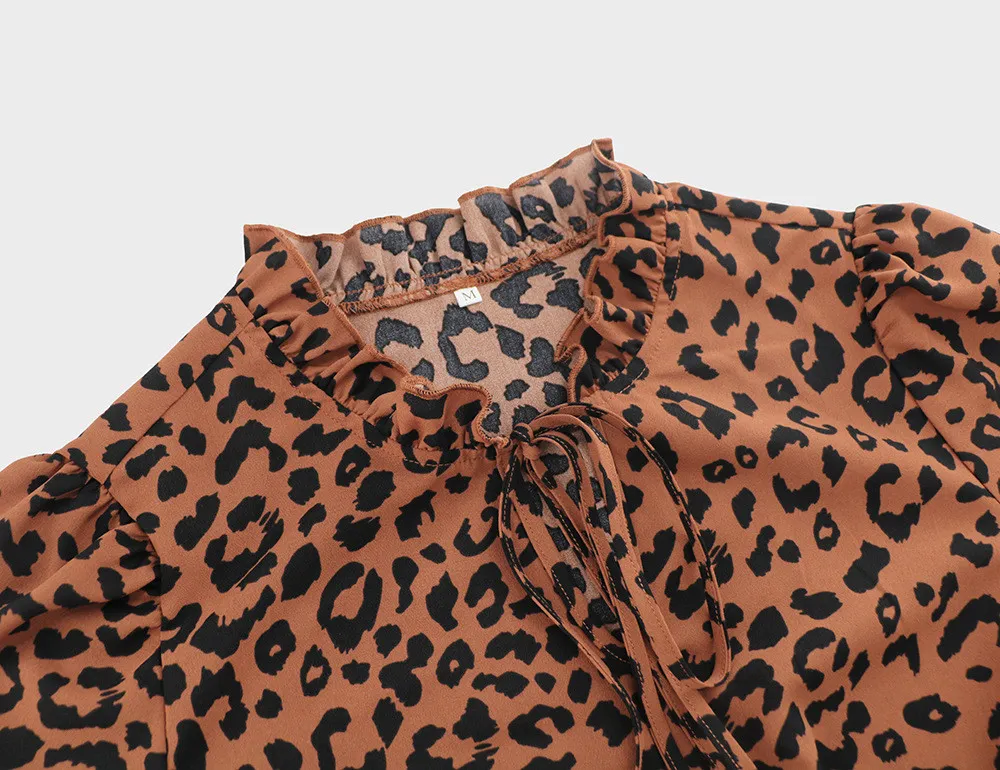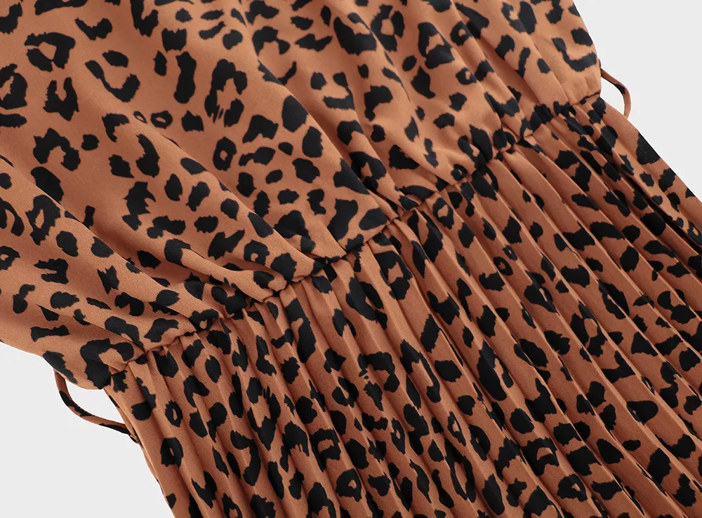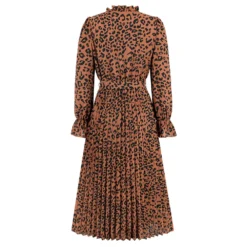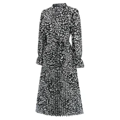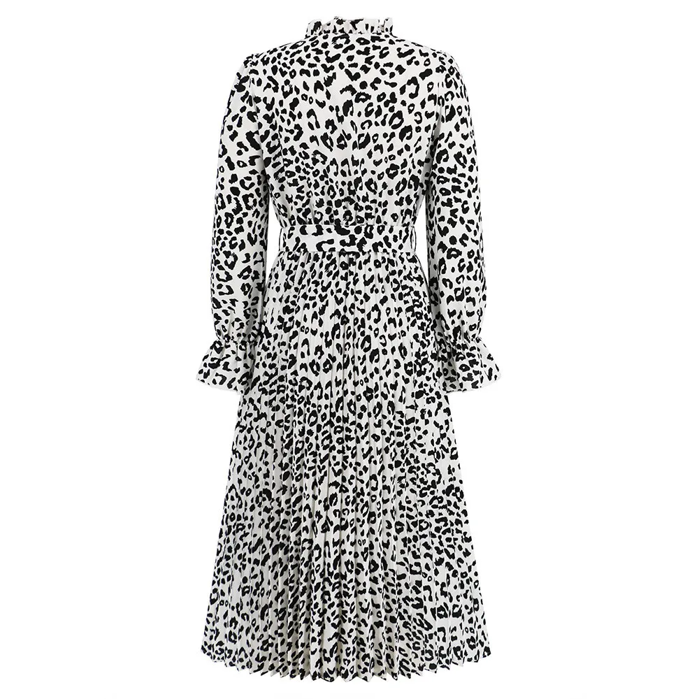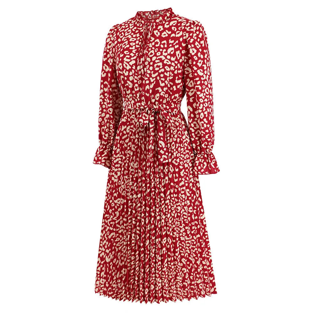 | Product Name | Fall Winter Ladies Chic Leopard Stand Collar Tie Pleated Casual Midi Dress |