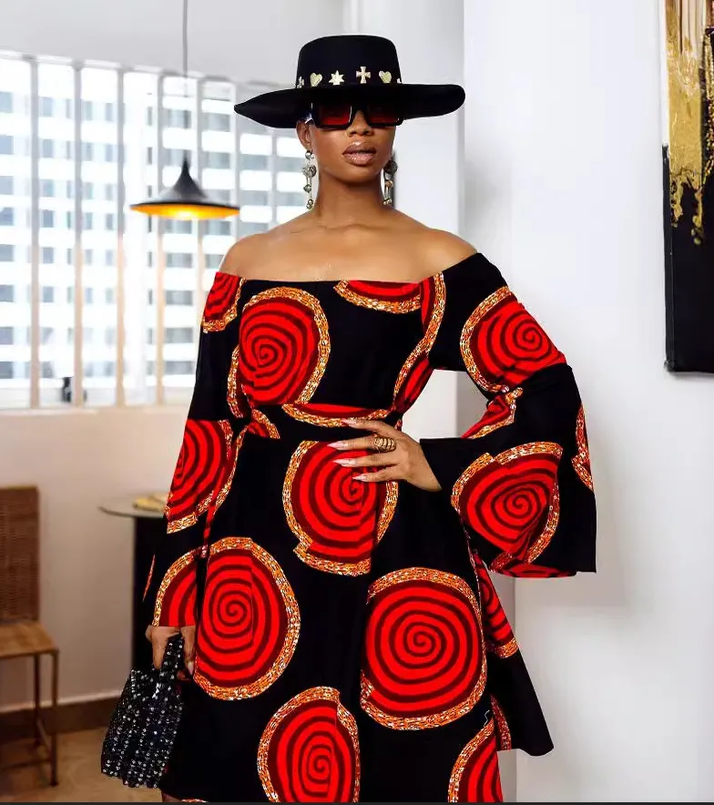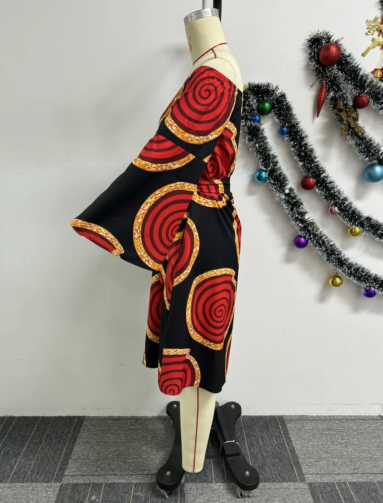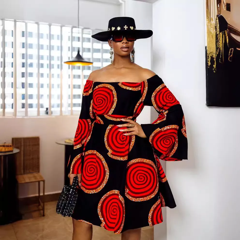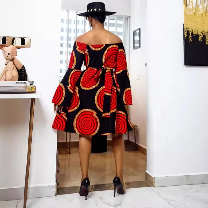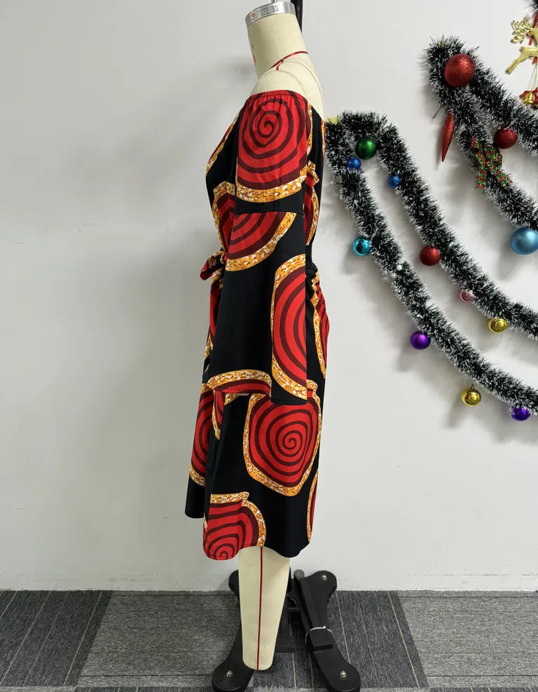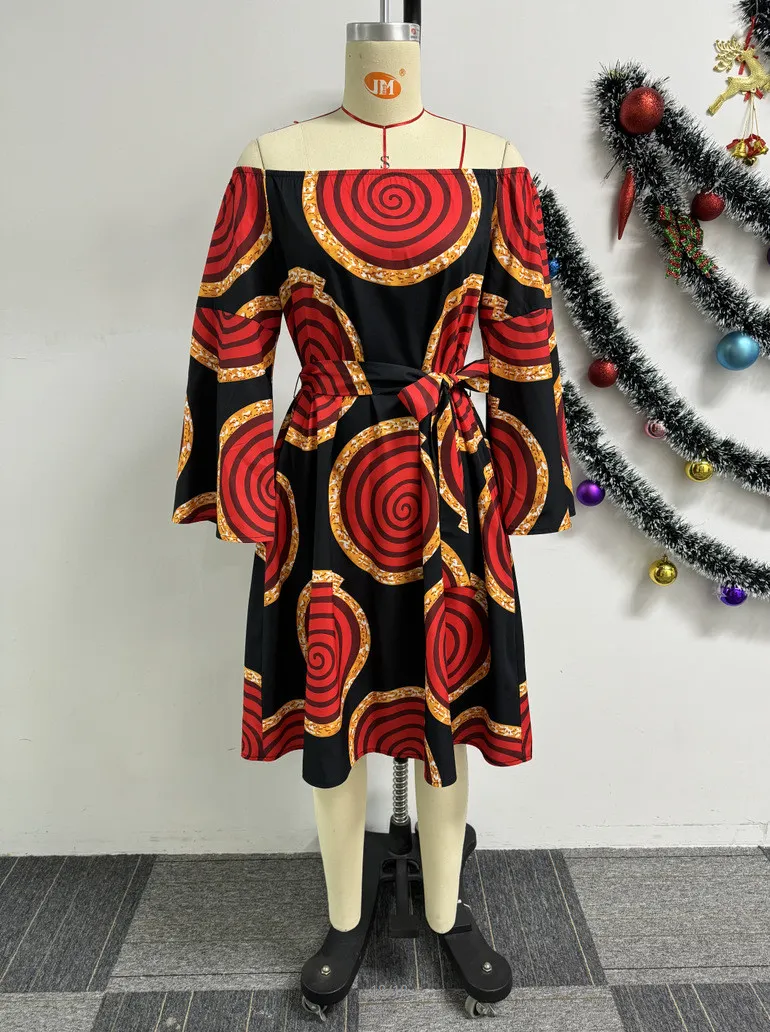| Product Name | Off Shoulder Printed Belt A-Line Loose Dress |