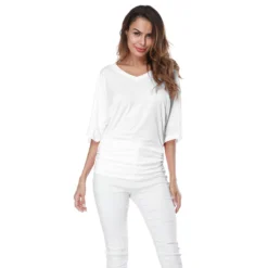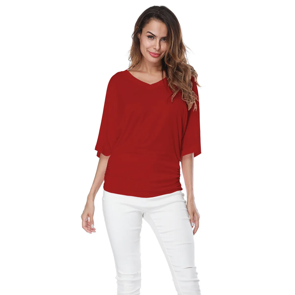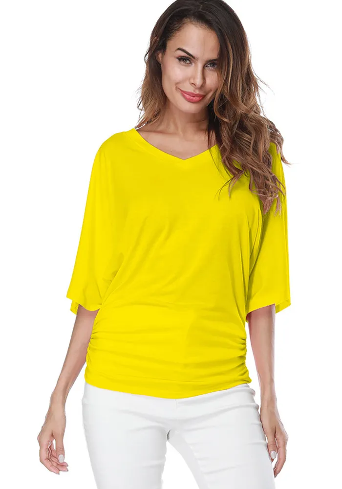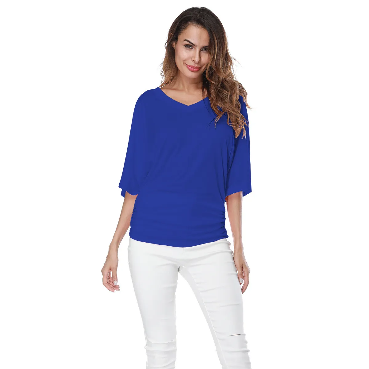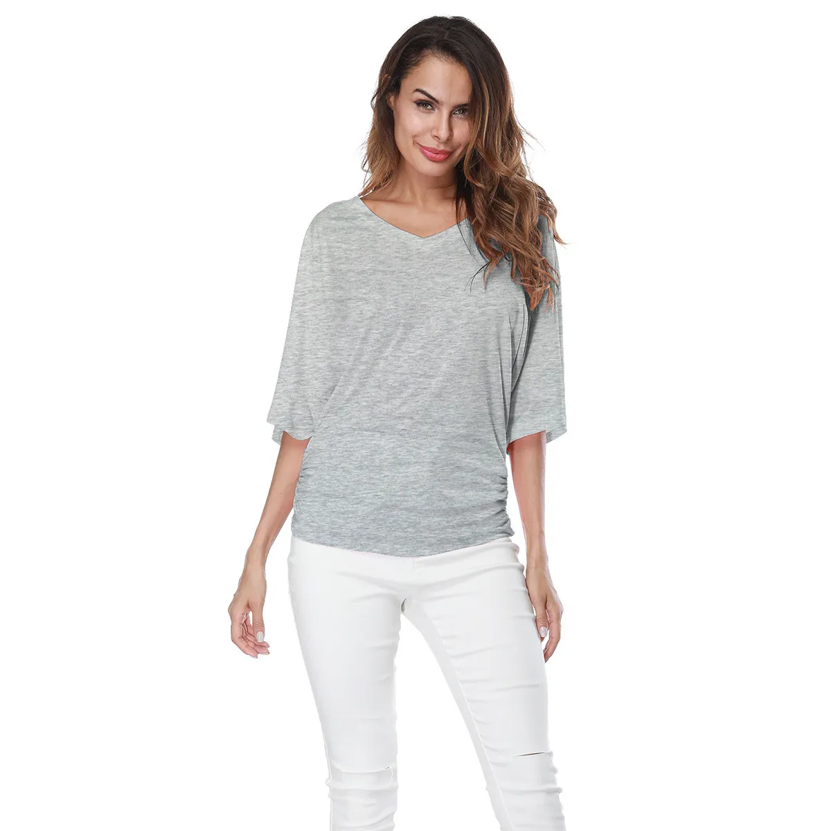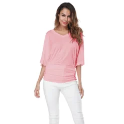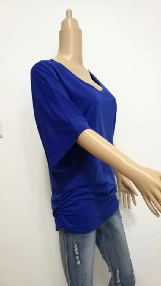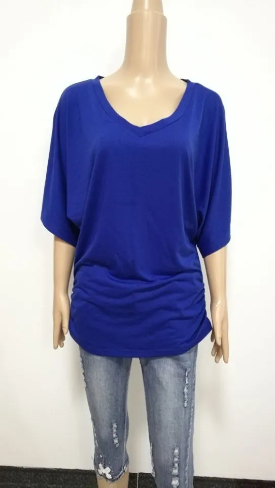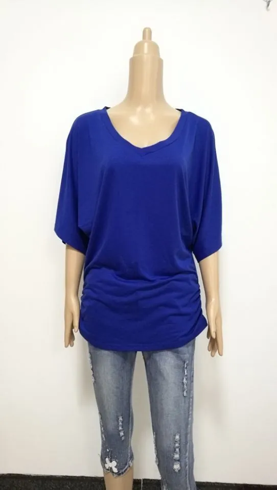 This Plus Size Women Loose Bat Sleeves v-Neck Short Sleeve t-Shirt Design Made Of Thick Polyster And Spandex Materail, Which Is Soft And Comfortable. It Is a Must-Have Item For All Seasons. Global Lover Offer Most Fashionable Wholesale Womenโs t Shirts – From Basic White And Black t Shirts To Lace, And Print t Shirts For Wholesale. We Also Make Customized Shirt With Your Personalized Logo And Print With Low Moq.
