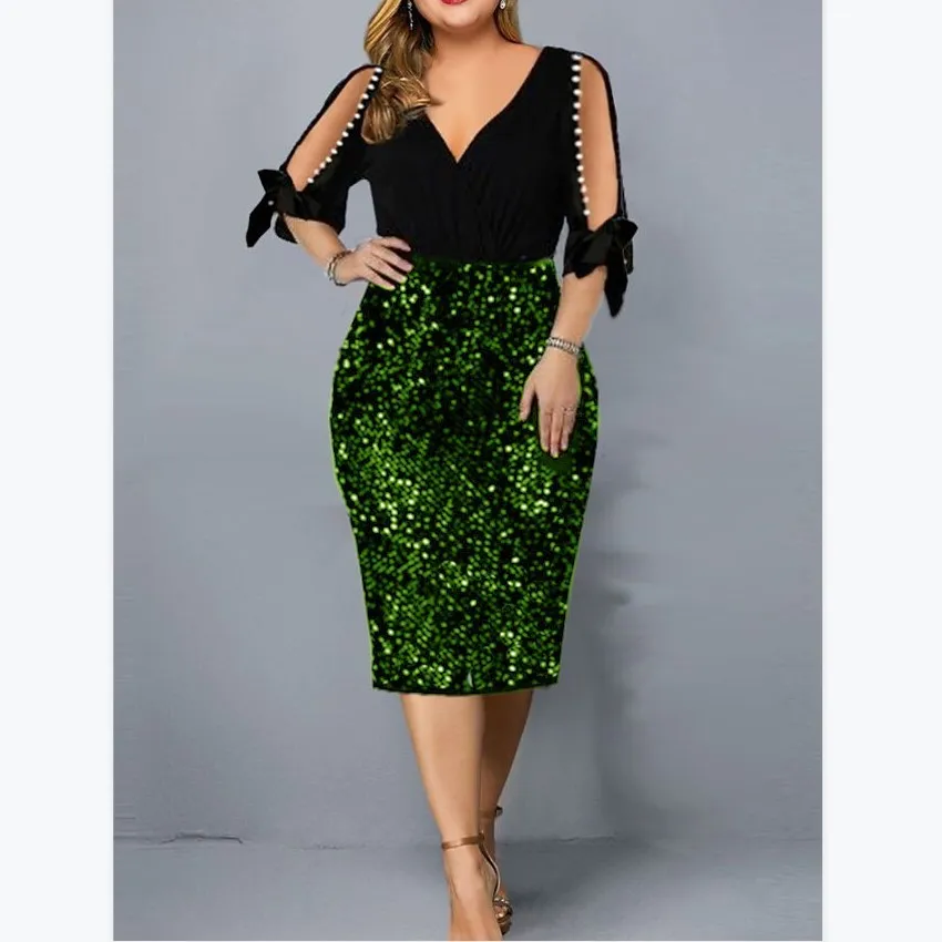 | Product Name | Plus Size Women V Neck Sequin Cutout Half Sleeve Dress |
