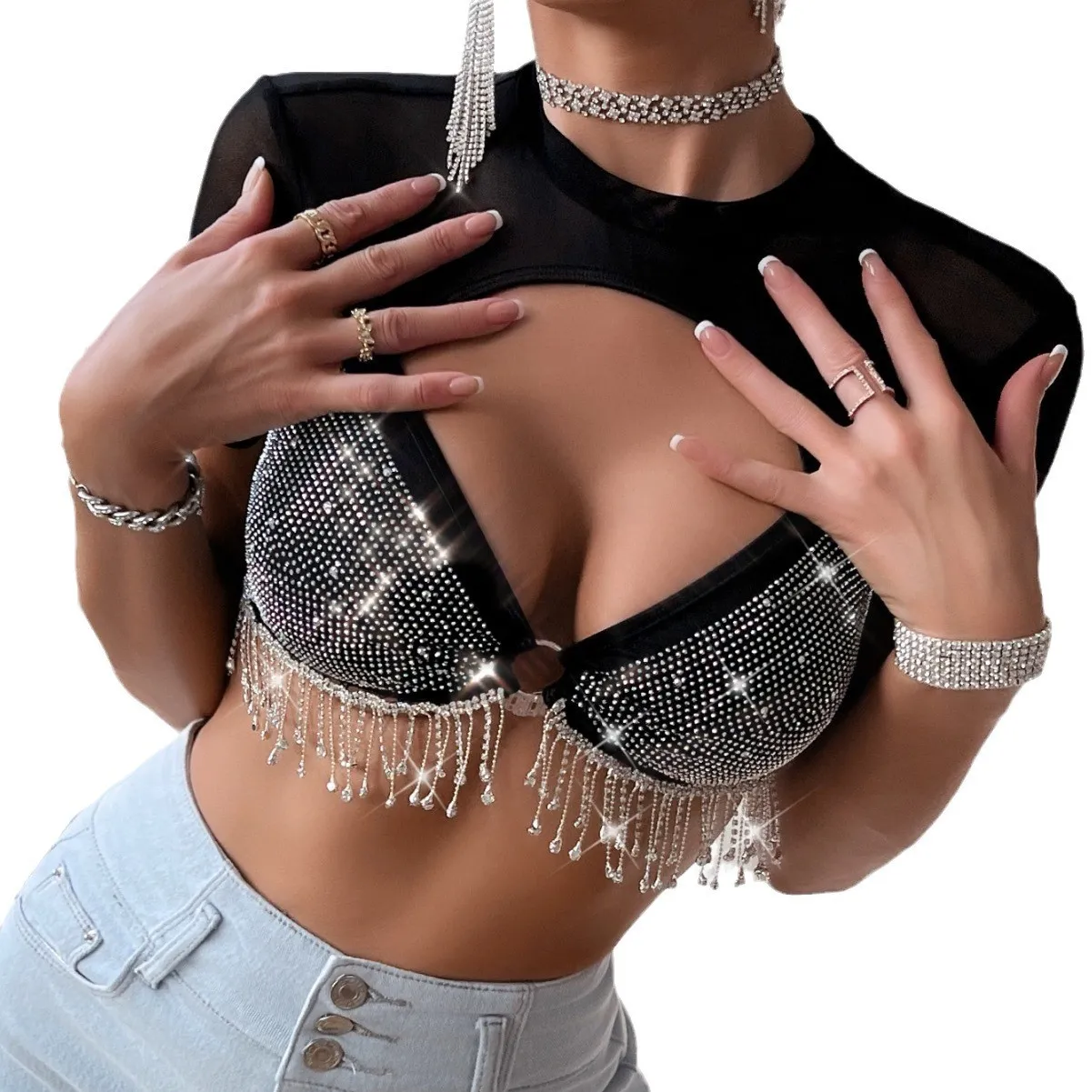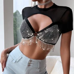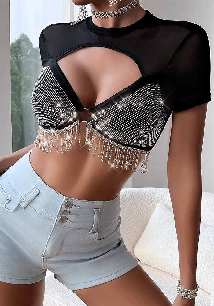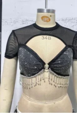 | Product Name | See-Through Lacemesh Beaded Tassels Crop Top |
