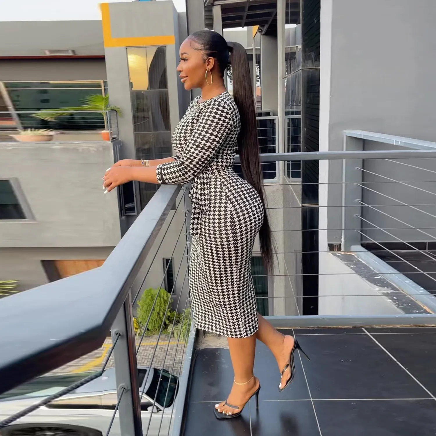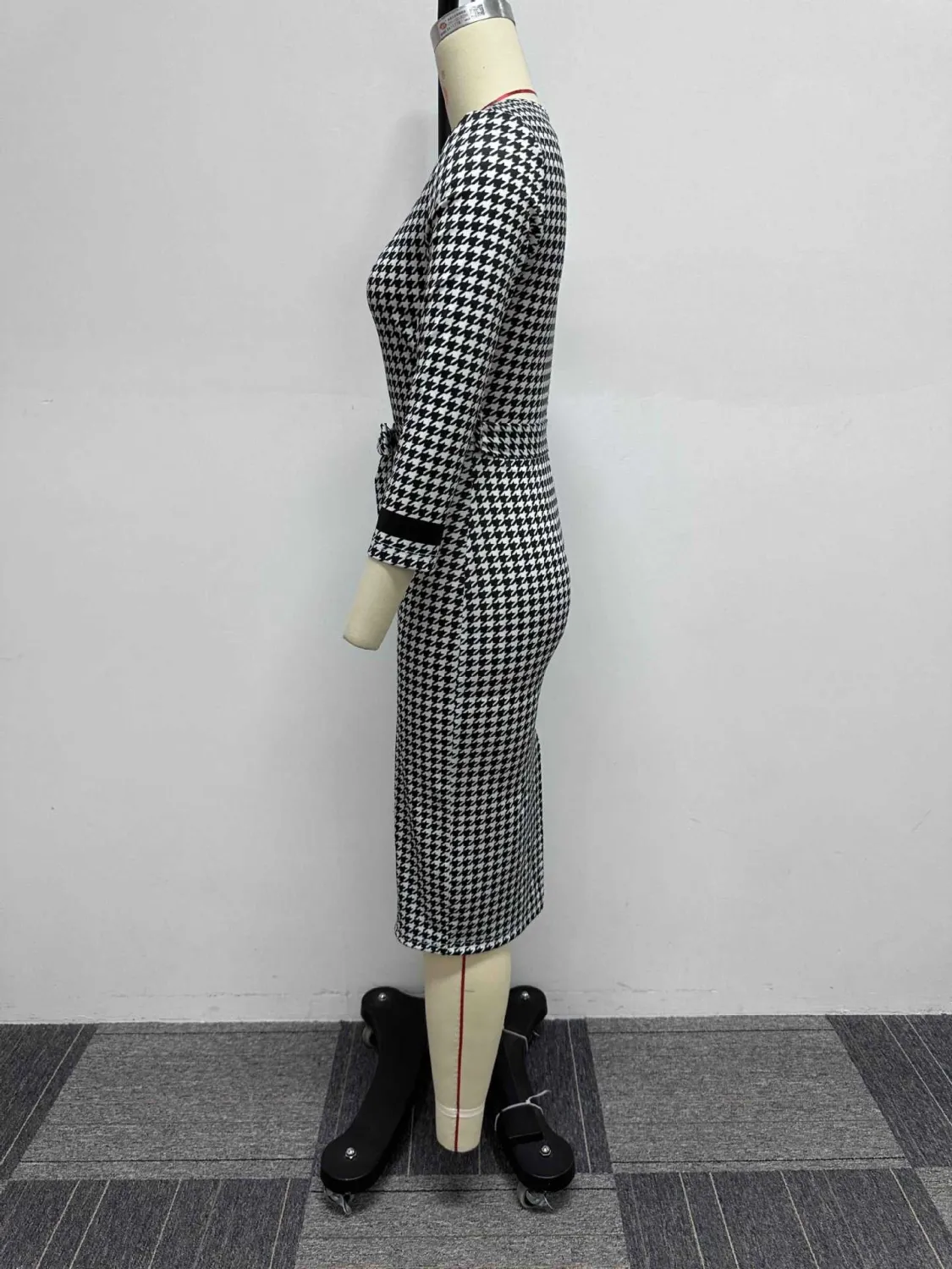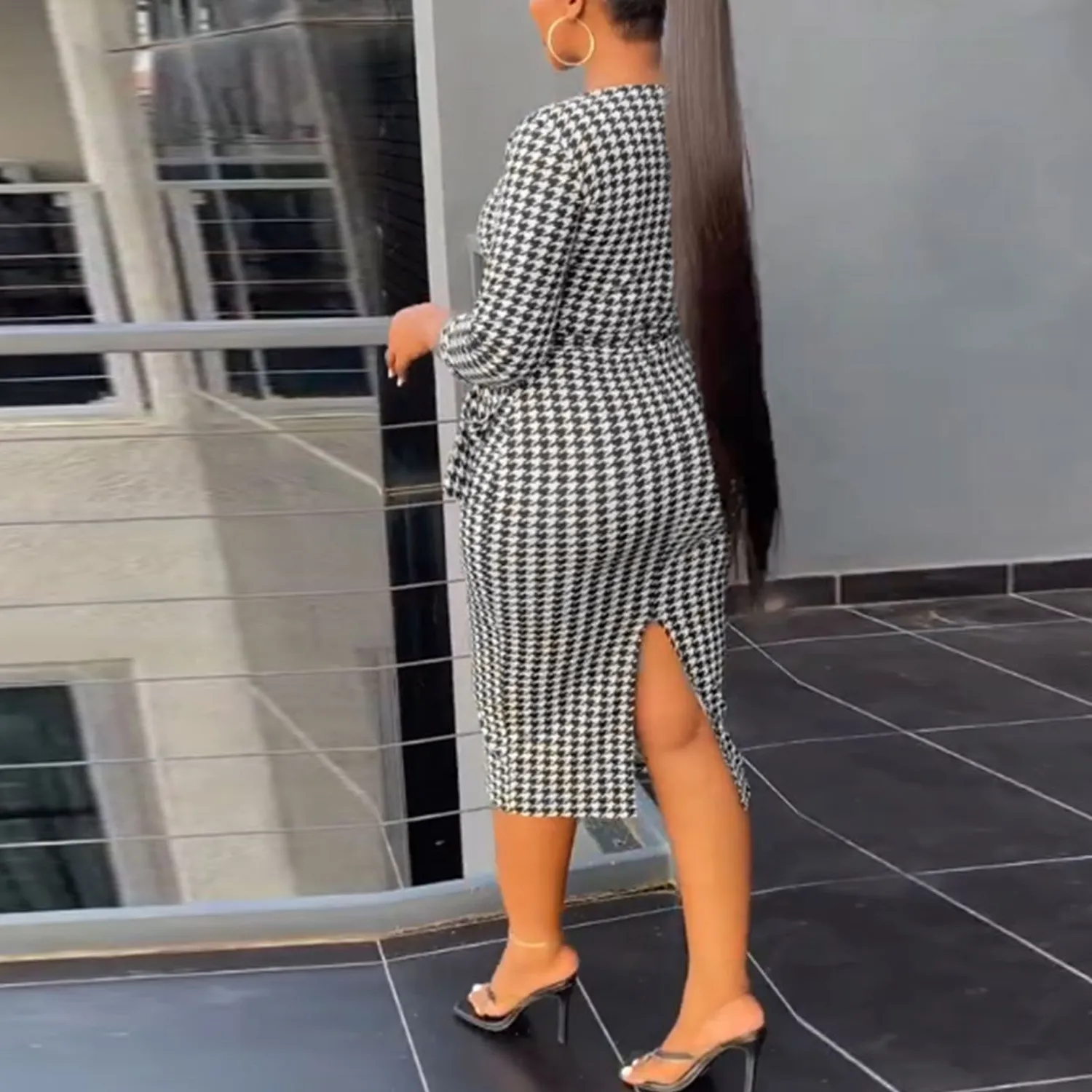 | Product Name | Sexy Printed Black And White Check Tight Fitting Midi Long Sleeve Bodycon Dress |