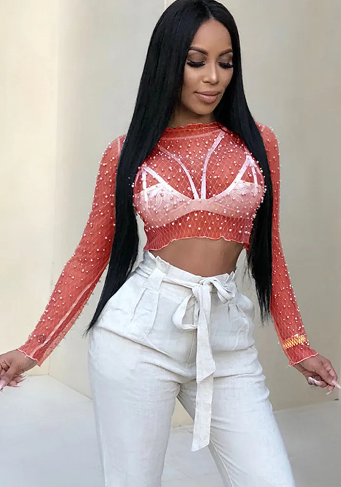 | Product Name | Sexy Women’S Long Sleeve Beaded Mesh Crop Top |