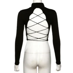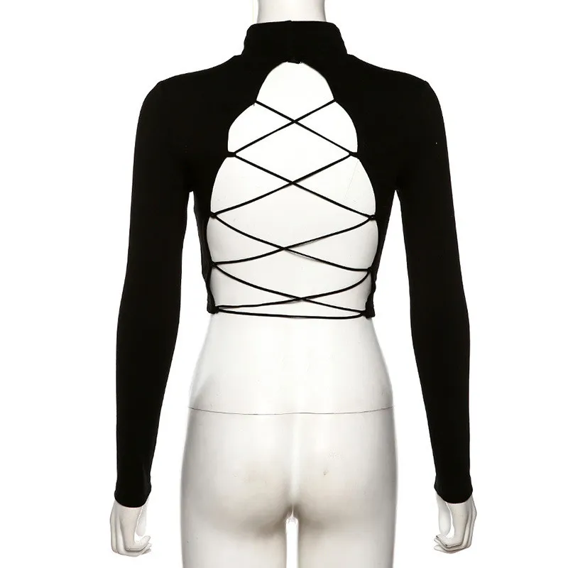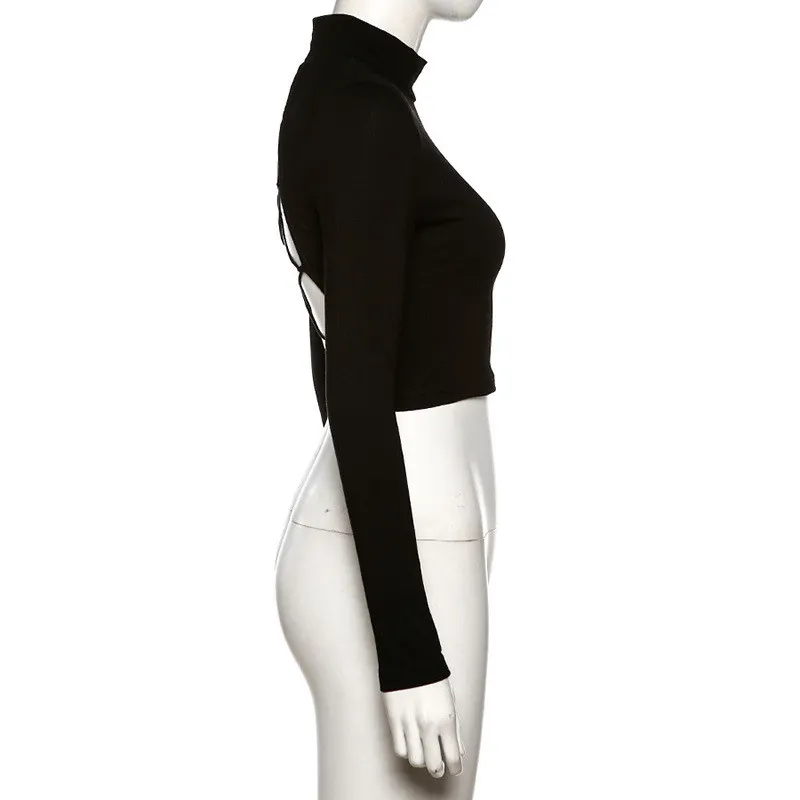 | Product Name | Spring Round Neck Long Sleeve Sexy Low Back Lace-Up Slim T-Shirt Women |