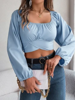 | Product Name | Spring/Summer Casual Lantern Sleeve Tie Slim Waist Chiffon Crop Top Women’s Clothing |