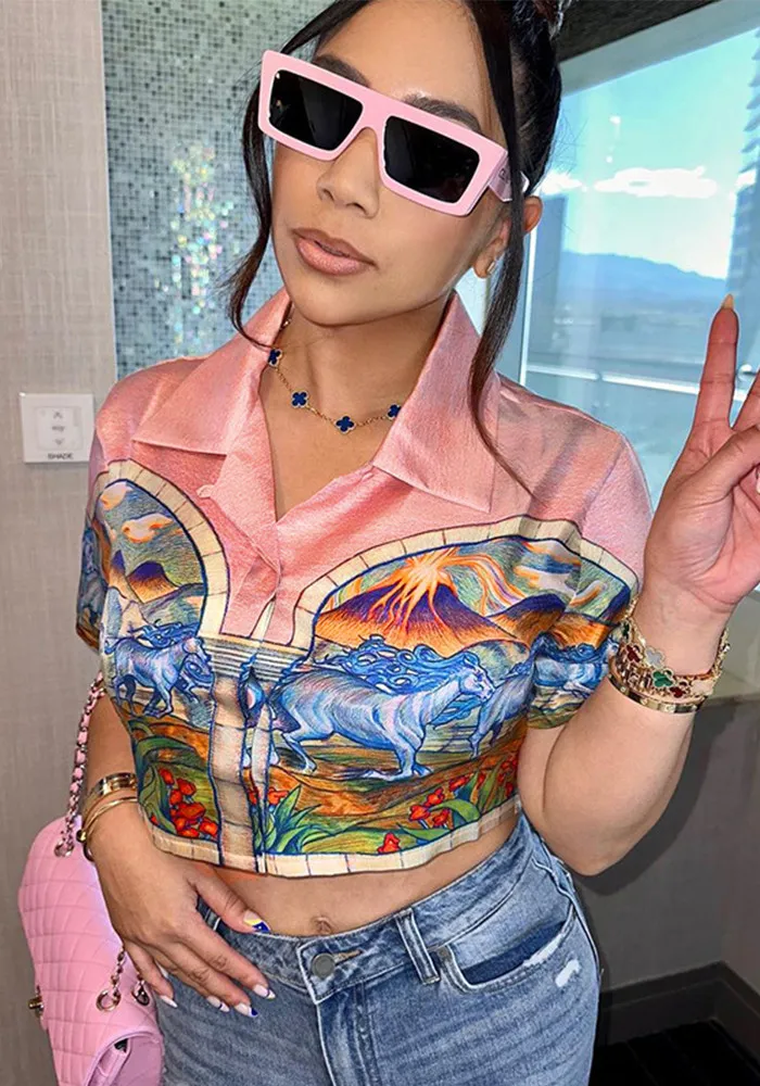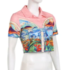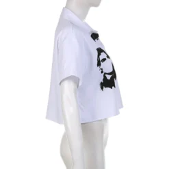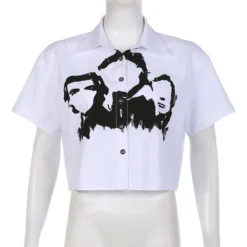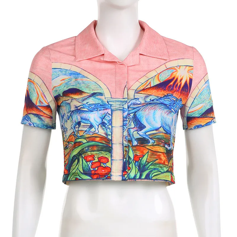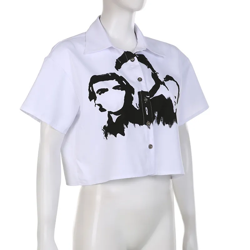 | Product Name | Spring Summer Fashion Trend Ladies Abstract Face Print Turndown Collar Short Sleeve Button Loose Cropped Shirt |