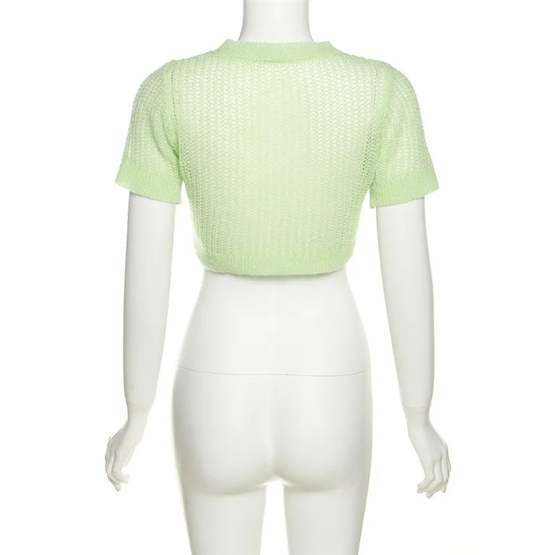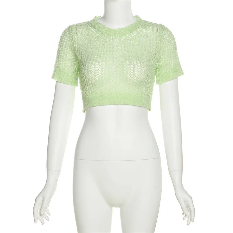 | Product Name | Spring Summer Women’S Round Neck Pullover Short Sleeve Crop See-Through Sexy Slim Knitting T-Shirt |