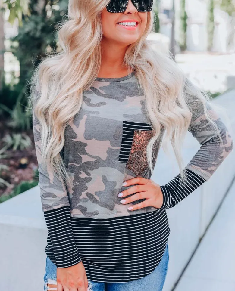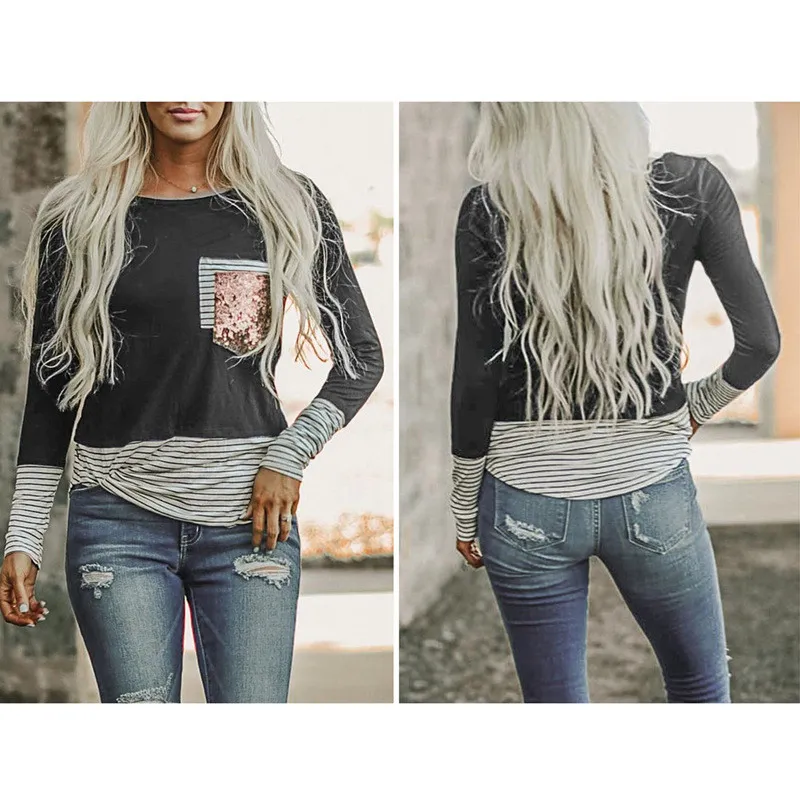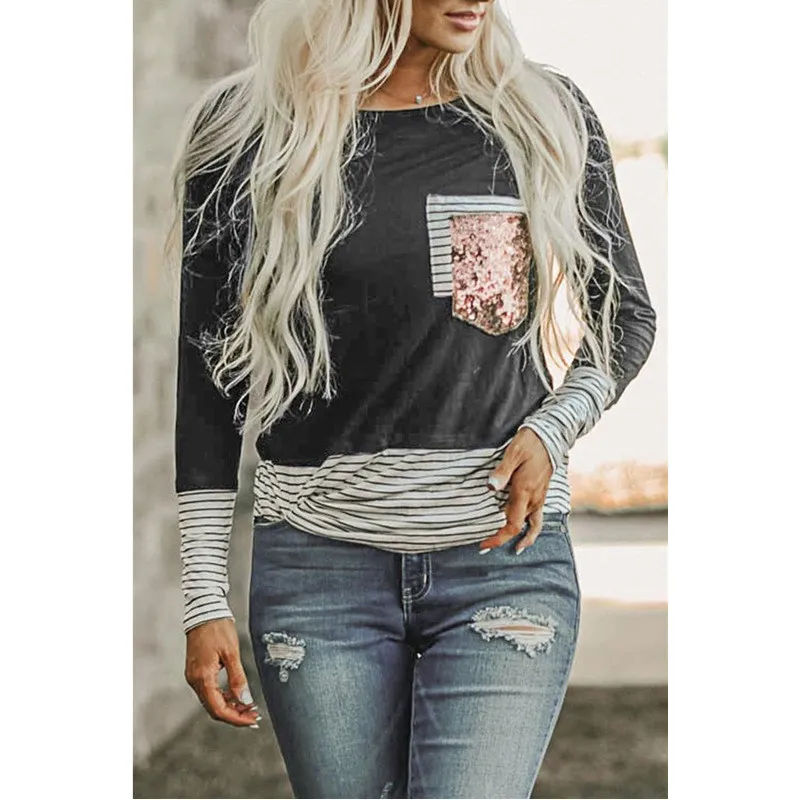 | Product Name | Winter and Spring Striped Print Round Neck Sequin Patchwork Women’s T-Shirt |