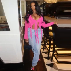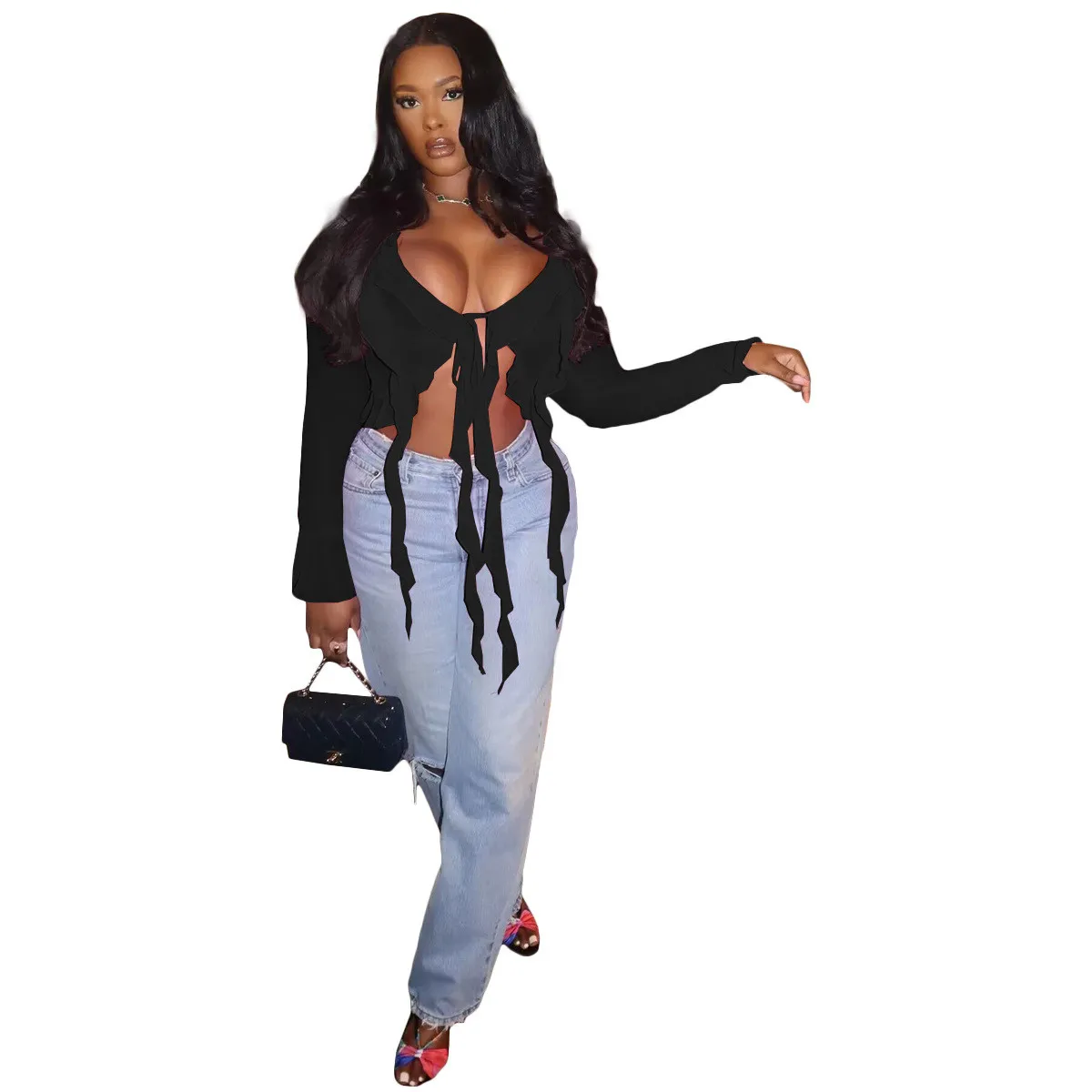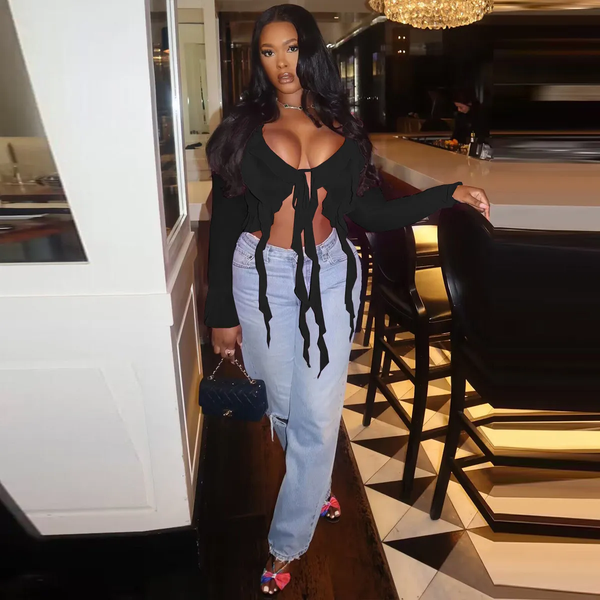 This Women Autumn v Neck Tie Ruffle Edge Long Sleeve Top Design Made Of Thick Polyster And Spandex Materail, Which Is Soft And Comfortable. Crop Tops For Women Almost Earn Enough Rate Of Second Glance In Summer. Cute Crop Tops Has Become a Summer Collocation Method Especially Favored By Young Ladies. Find Huge Selection Of Cheap Wholesale Sexy Crop Tops At Global Lover Now.