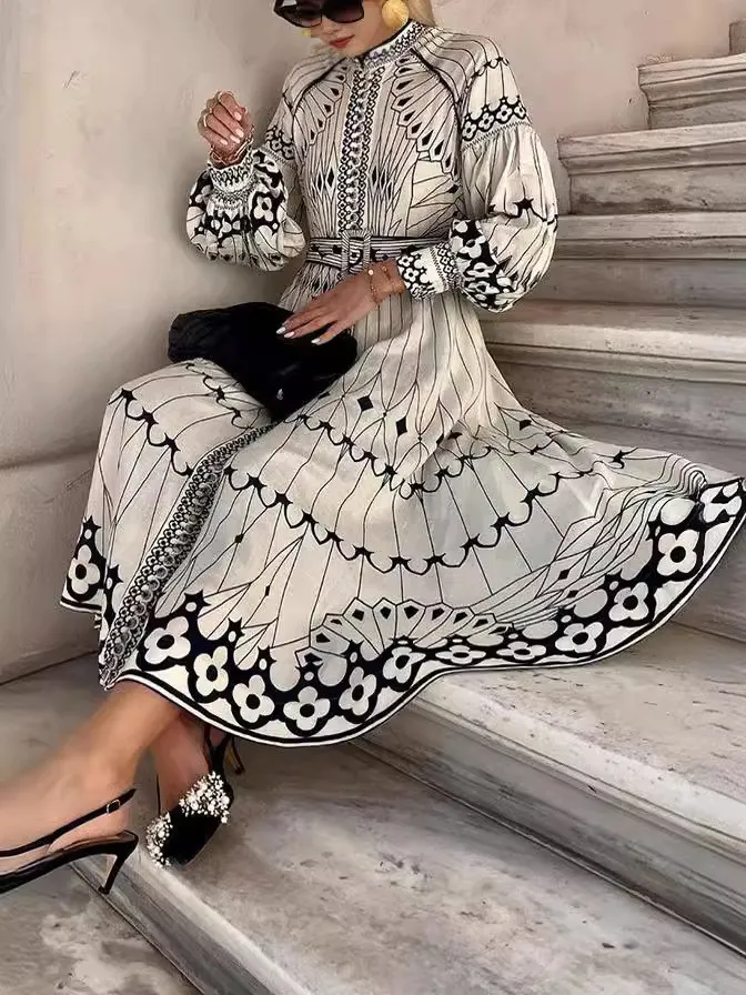 | Product Name | Women Elegant Long Sleeve Belt Button Printed Dress |