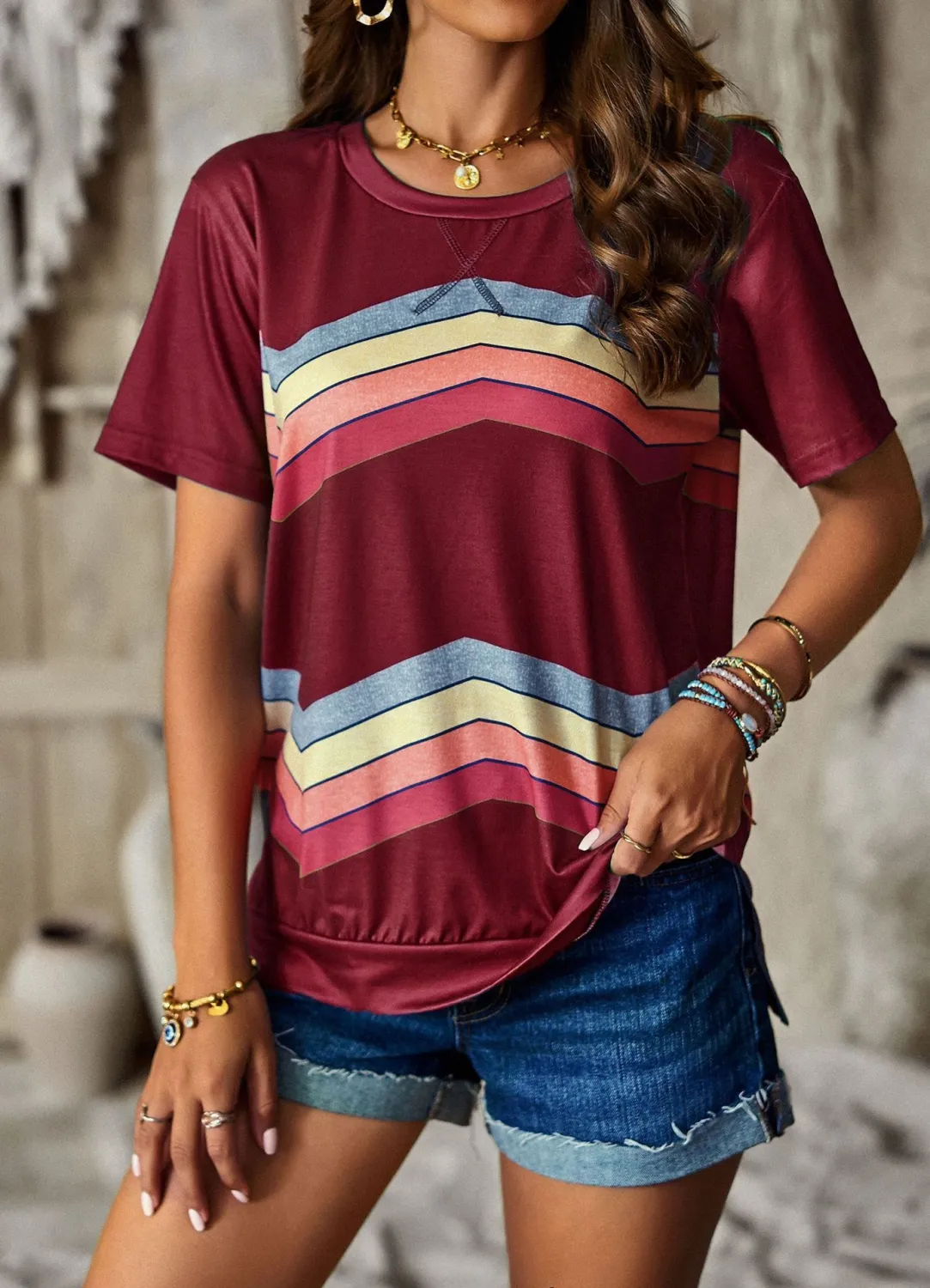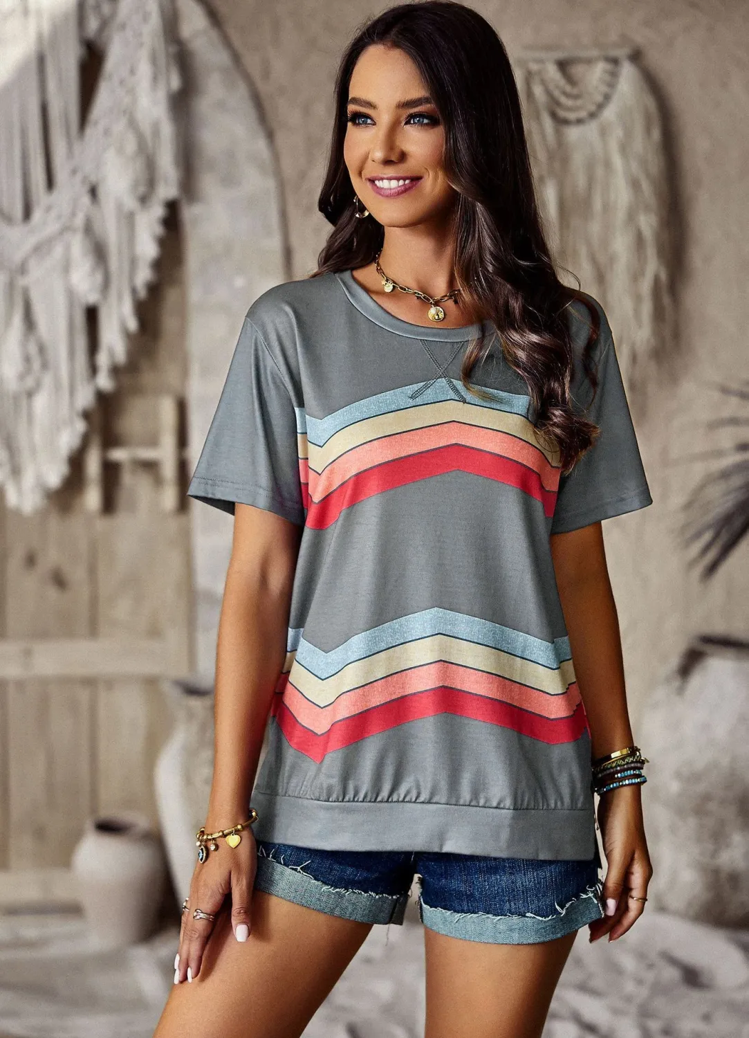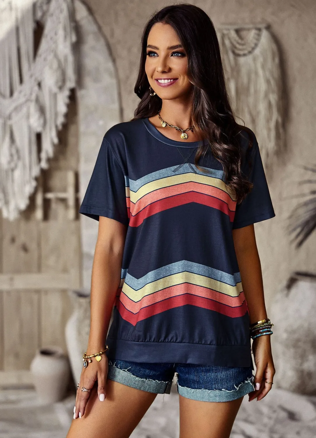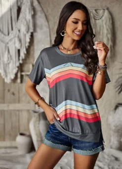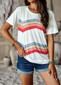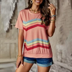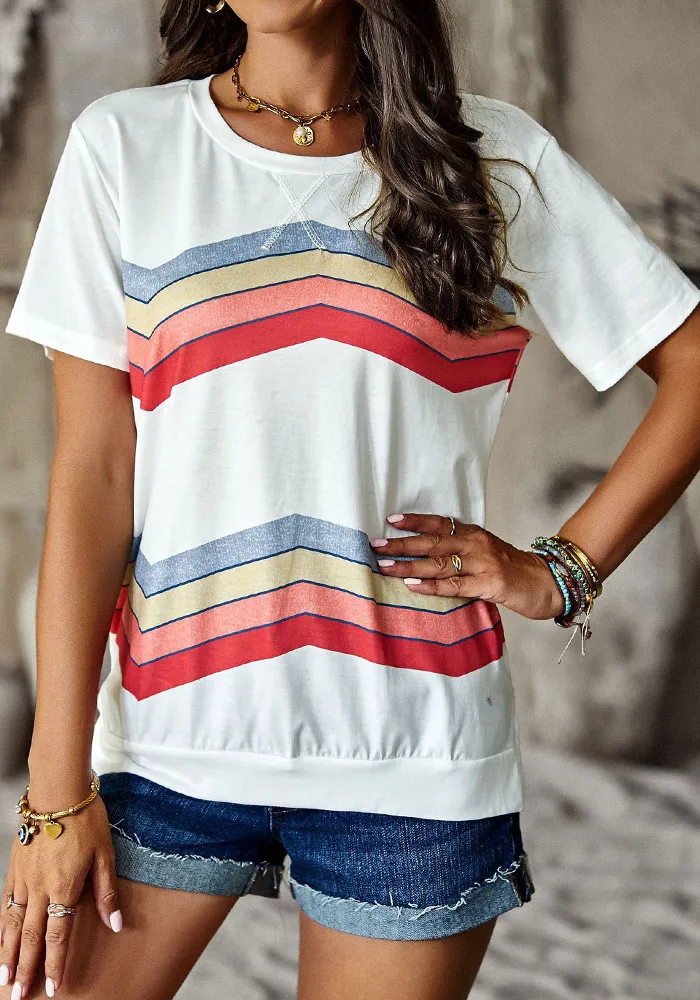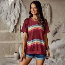 | Product Name | Women Round Neck Rainbow Stripe Short Sleeve T-Shirt |