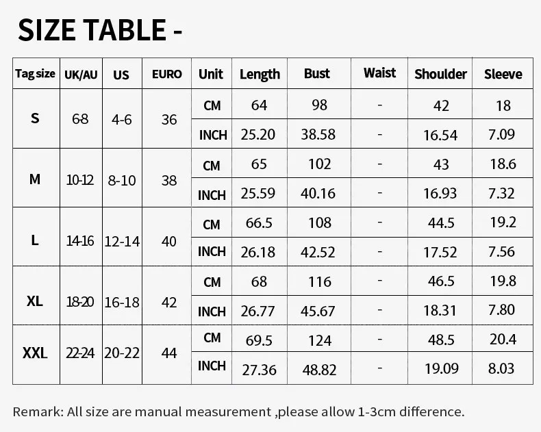 High Elasticity Fabric๏ผPlease add 0-0.5 CM from the garment size to body size.