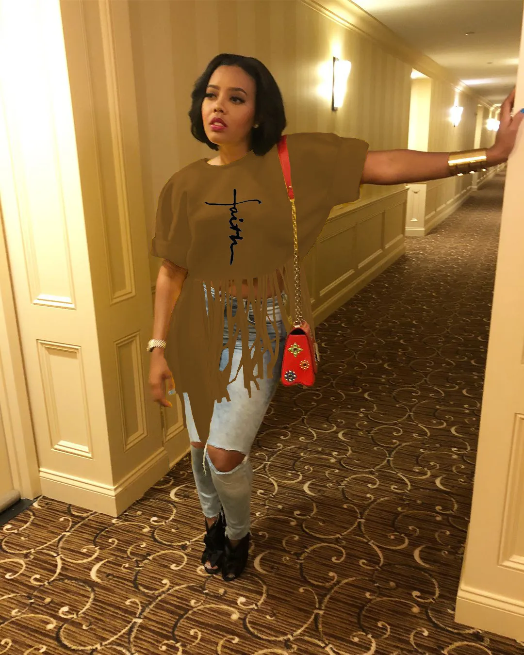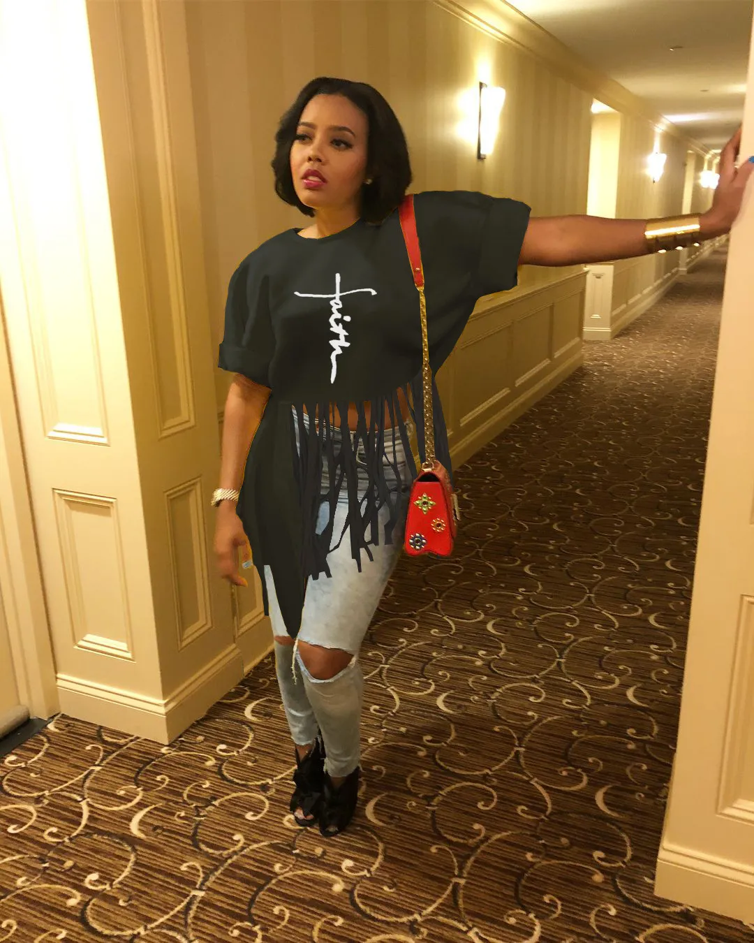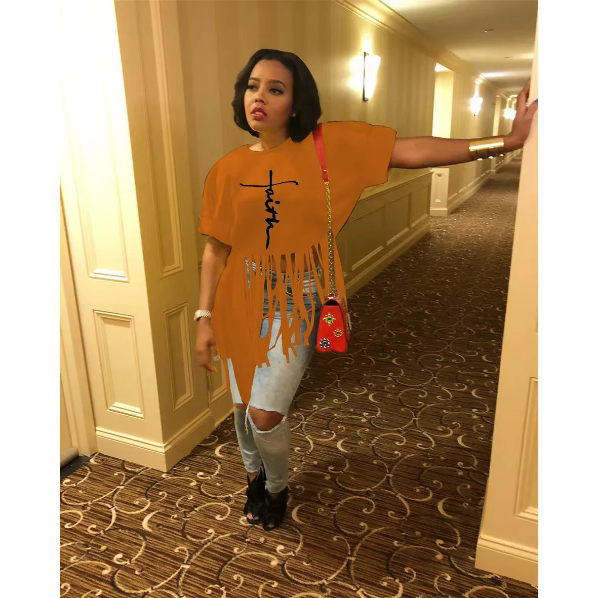 This Women Round Neck Short Sleeve Printed Fringe t-Shirt Design Made Of Thick Polyster And Spandex Materail, Which Is Soft And Comfortable. It Is a Must-Have Item For All Seasons. Global Lover Offer Most Fashionable Wholesale Women’s t Shirts – From Basic White And Black t Shirts To Lace, And Print t Shirts For Wholesale. We Also Make Customized Shirt With Your Personalized Logo And Print With Low Moq.