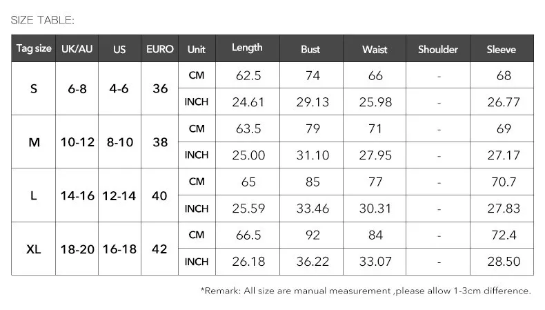 High Elasticity Fabric:Please add 0-0.5 CM from the garment size to body size.