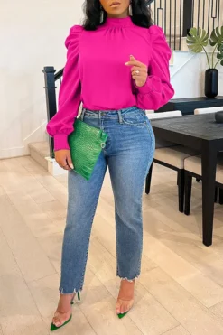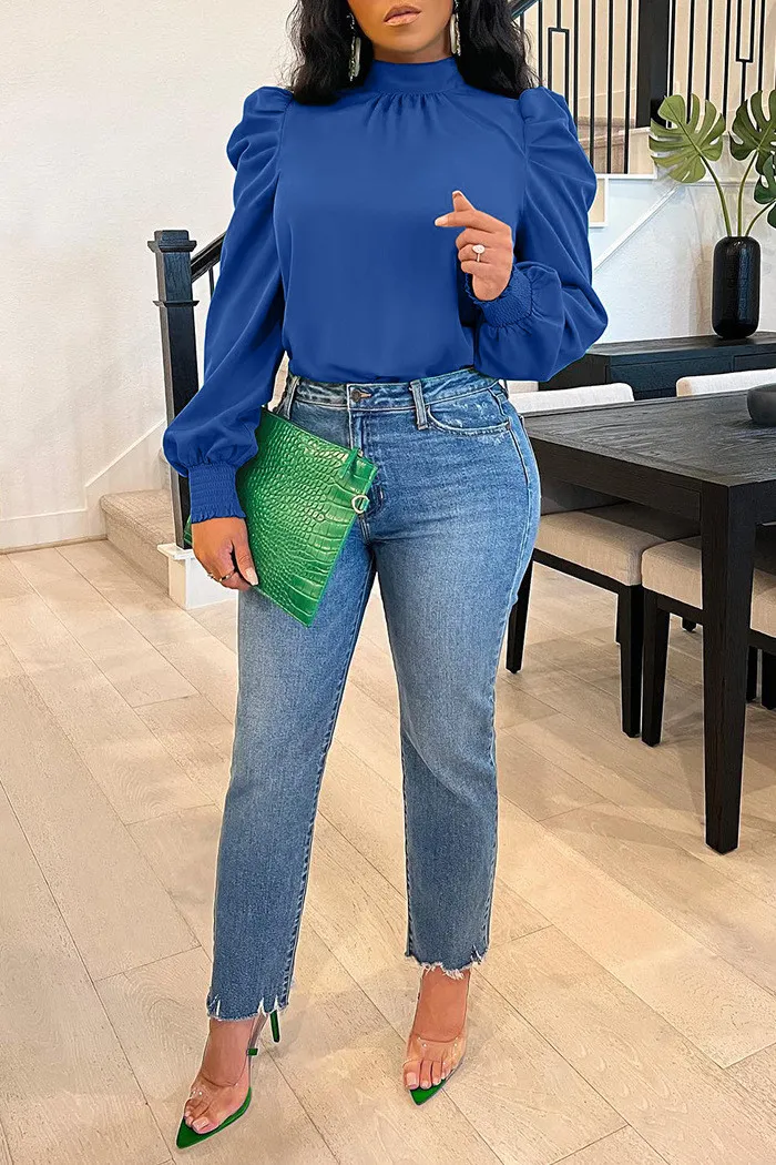 | Product Name | Women Solid Stand Collar Puffed Sleeve Top |